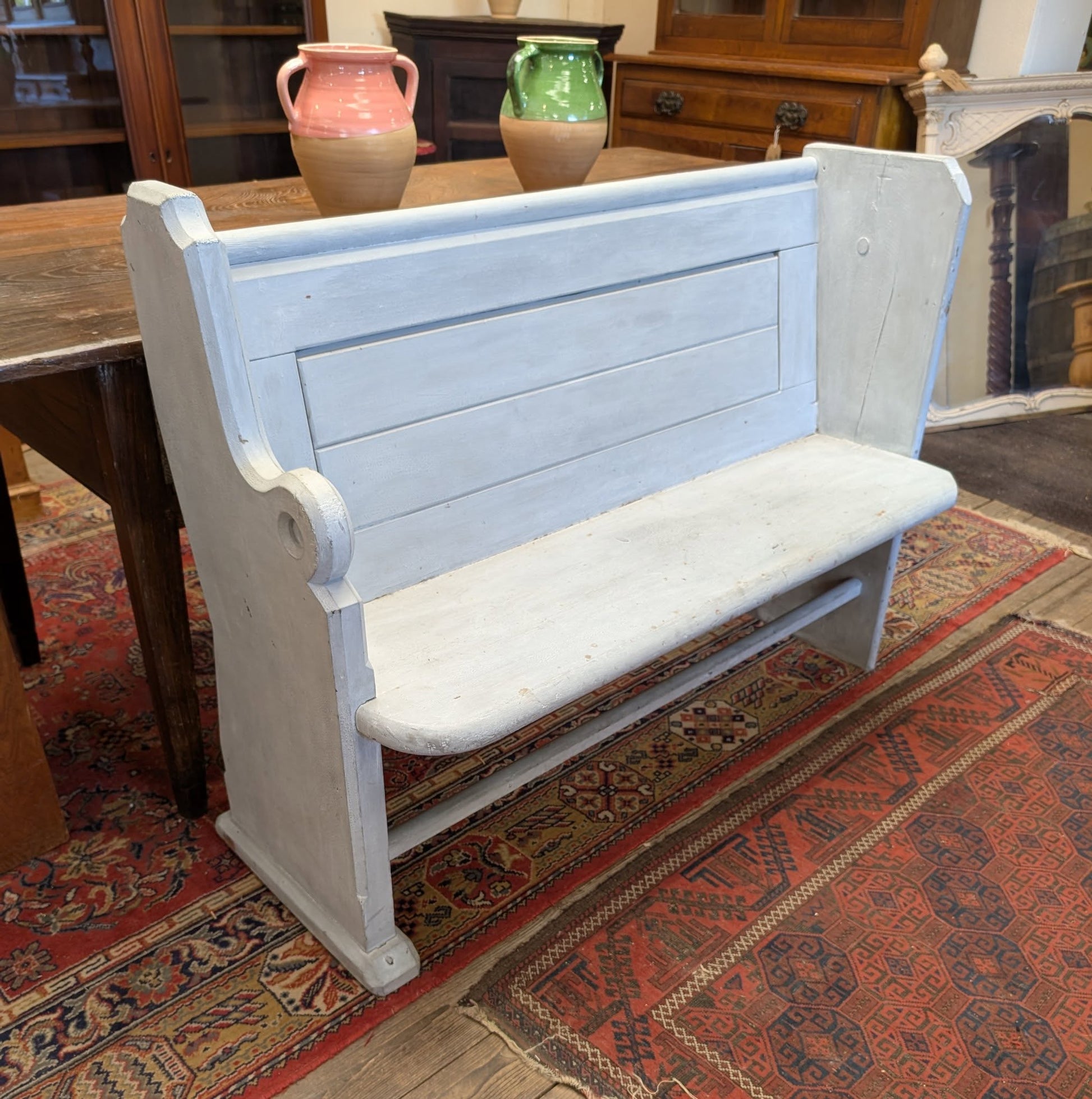 A little 4ft pew in quite shabby grey paint. This has obviously been cut down by someone and the ends don't match but it's a decent little pew and priced accordingly.
