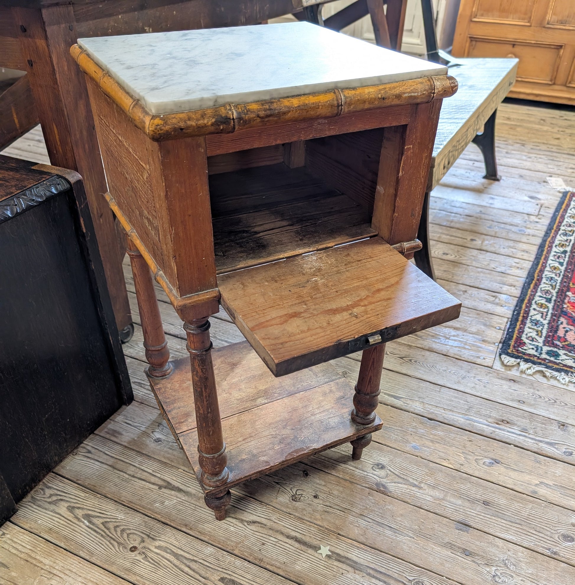 A great little antique pot cupboard with inset marble top, faux bamboo detailing and drop down door.
