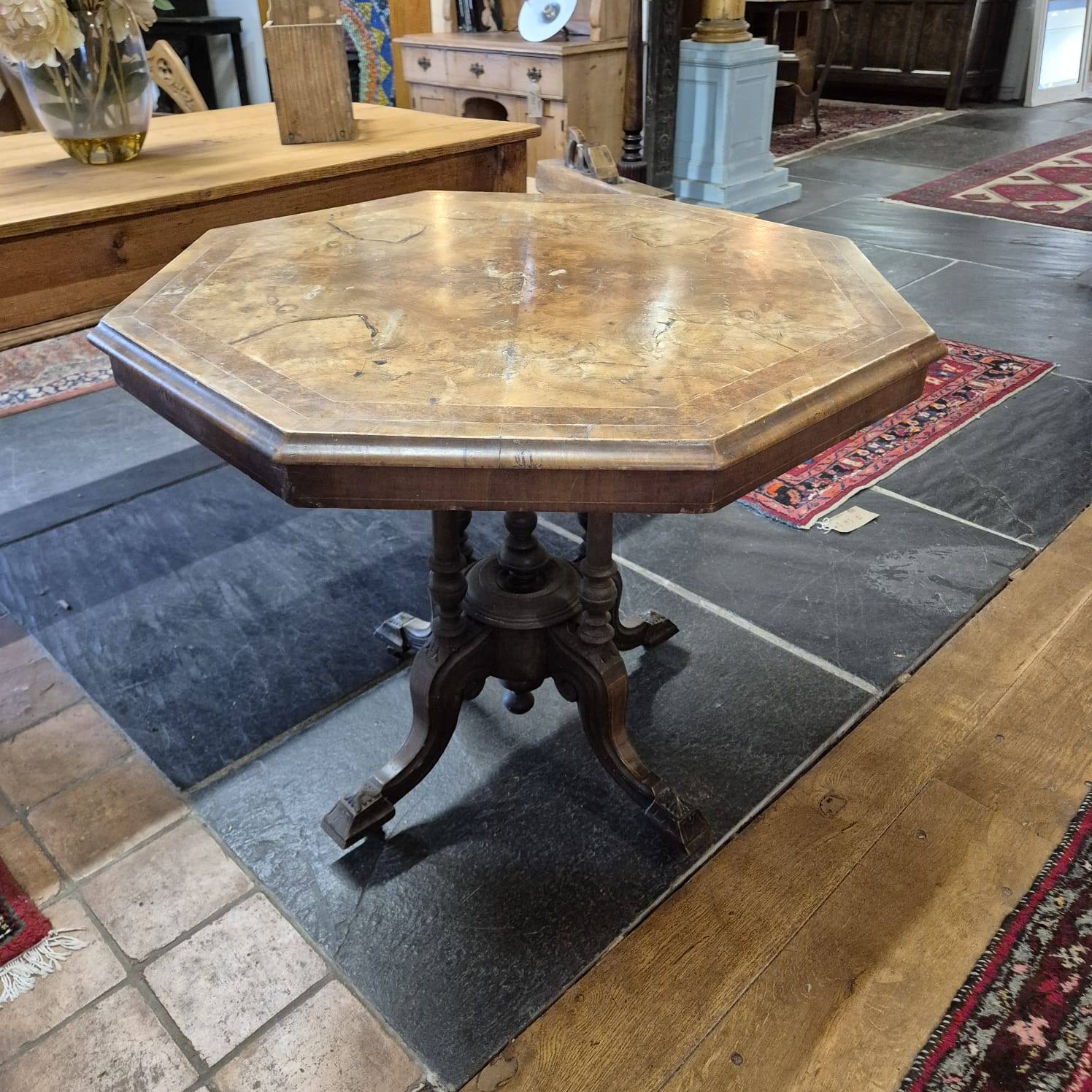 A nice antique octagonal table we reclaimed from a local farm. The top may need a bit of attention due to some chipped vaneer but a lovely piece otherwise.