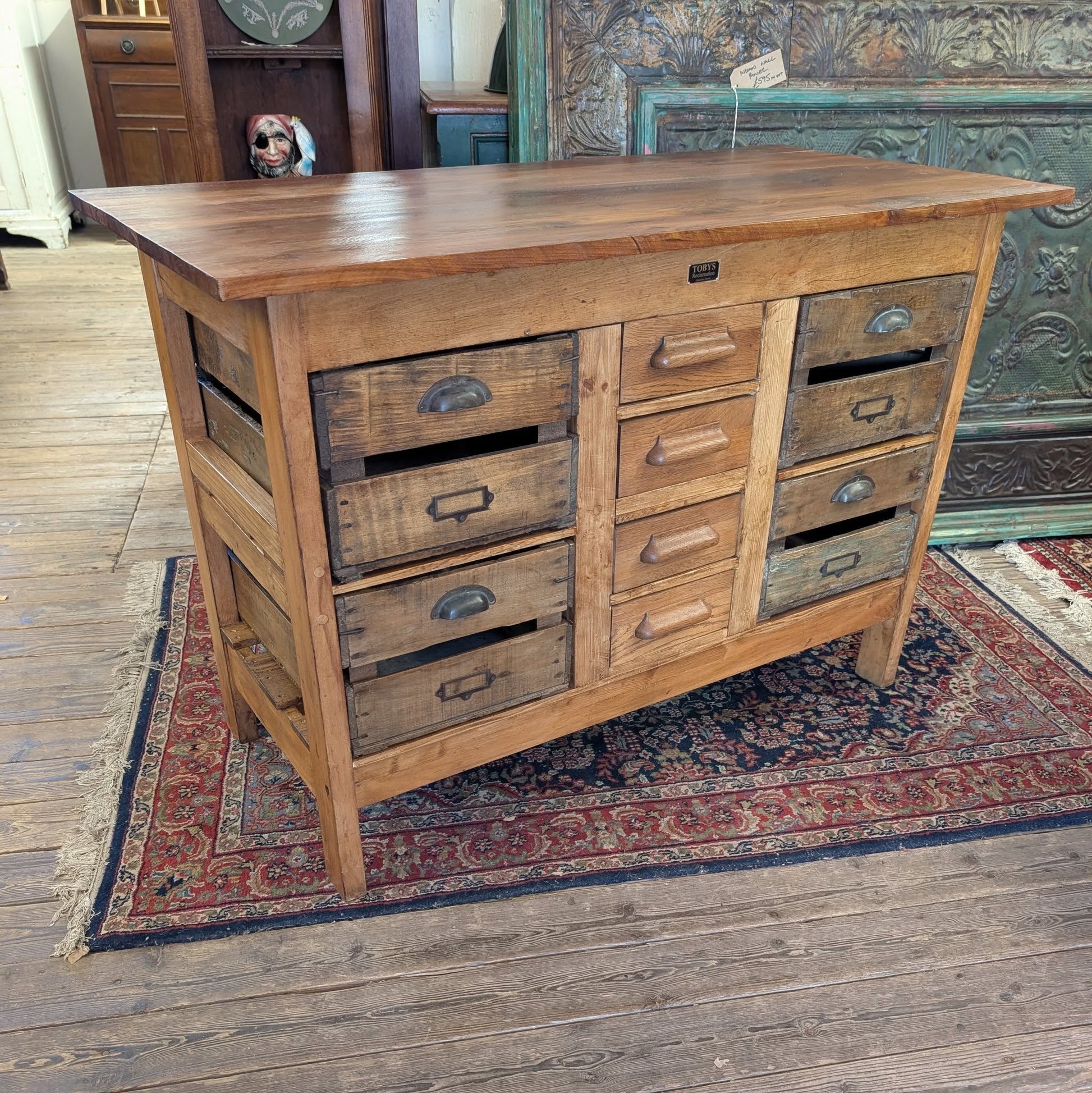 A beautiful sideboard made in our workshop from reclaimed pieces from around the yard including: a school science lab table base, some Belgian apple crates, a set of drawers from an old oak desk and a reclaimed teak worktop!