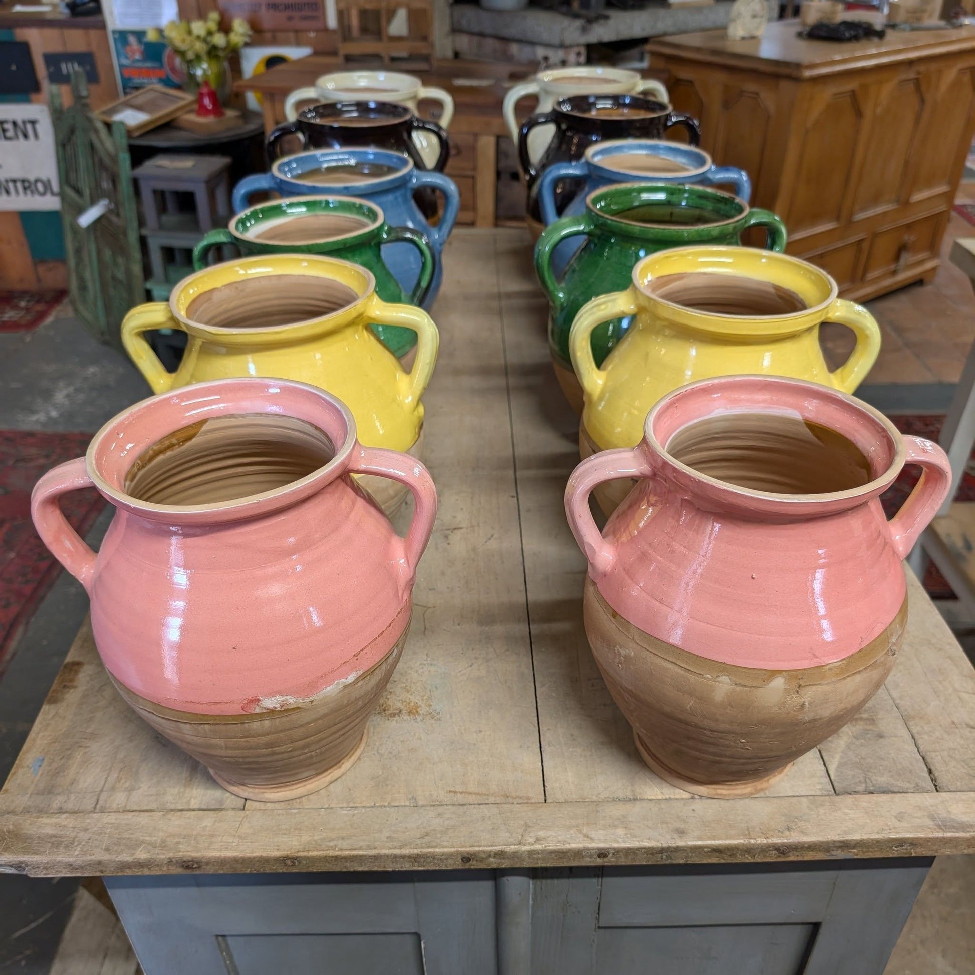 We have more of these beautiful painted ceramic pots in stock. They are inspired by French confit pots with the half glazing and are very lovely looking things.