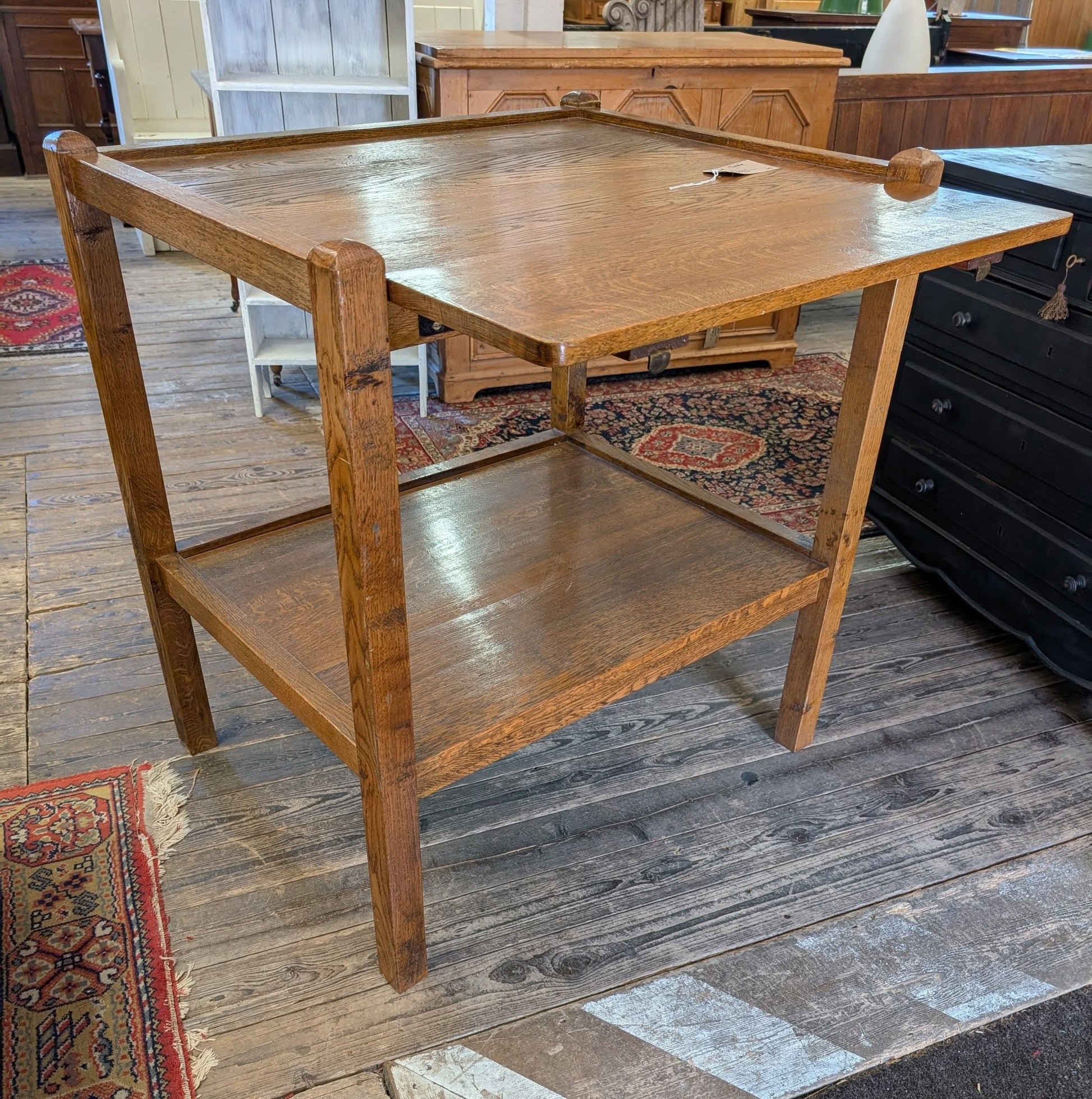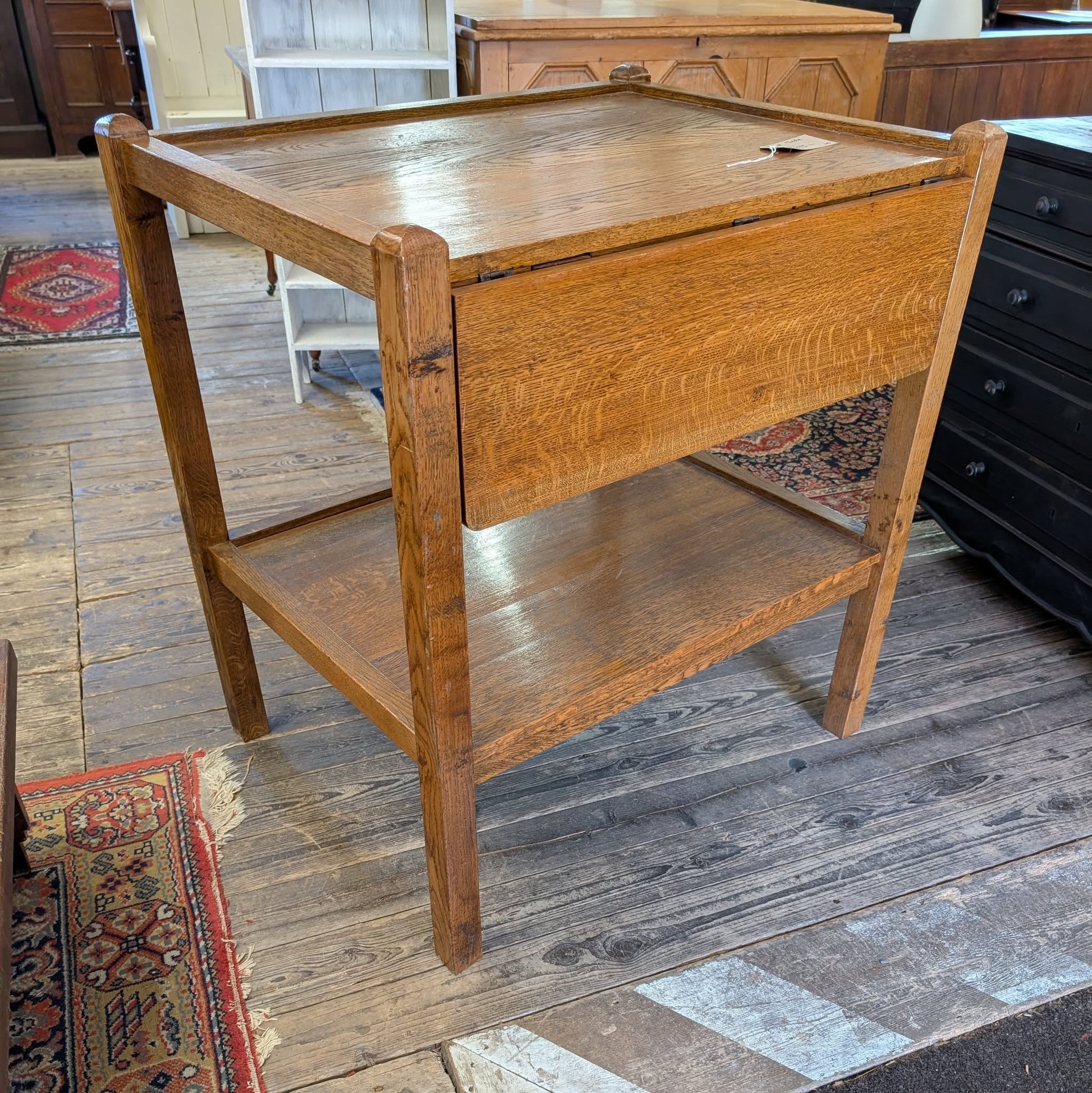 A lovely early 20th century tiered side table/server. A great old thing in oak with one lift up flap and pull out supports.