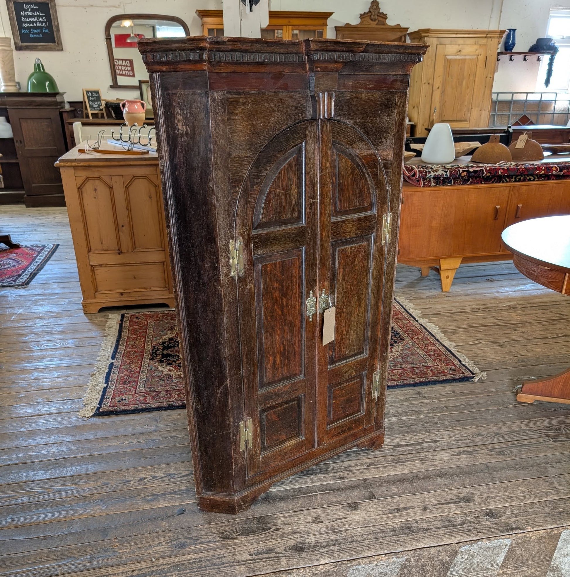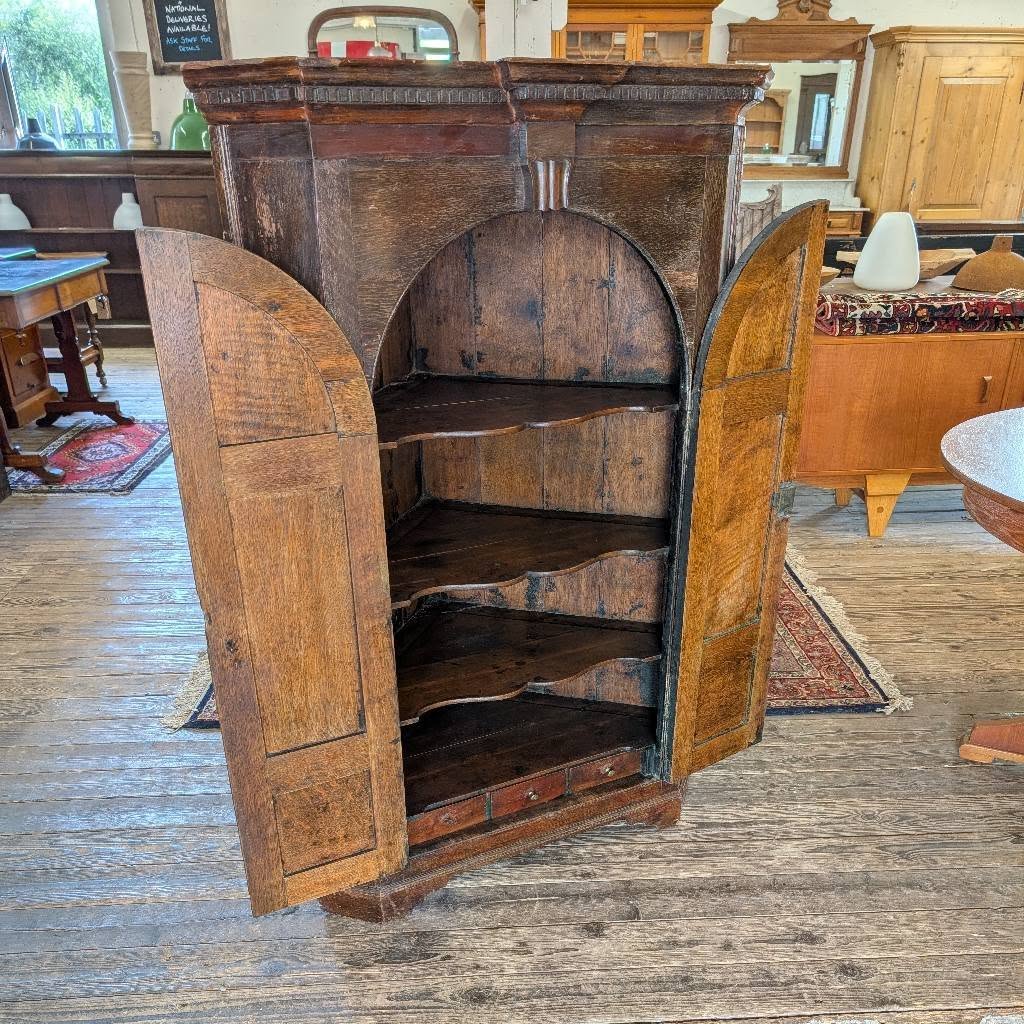 A floorstanding 19th century oak corner cupboard with little drawers at the bottom. A nice old piece.