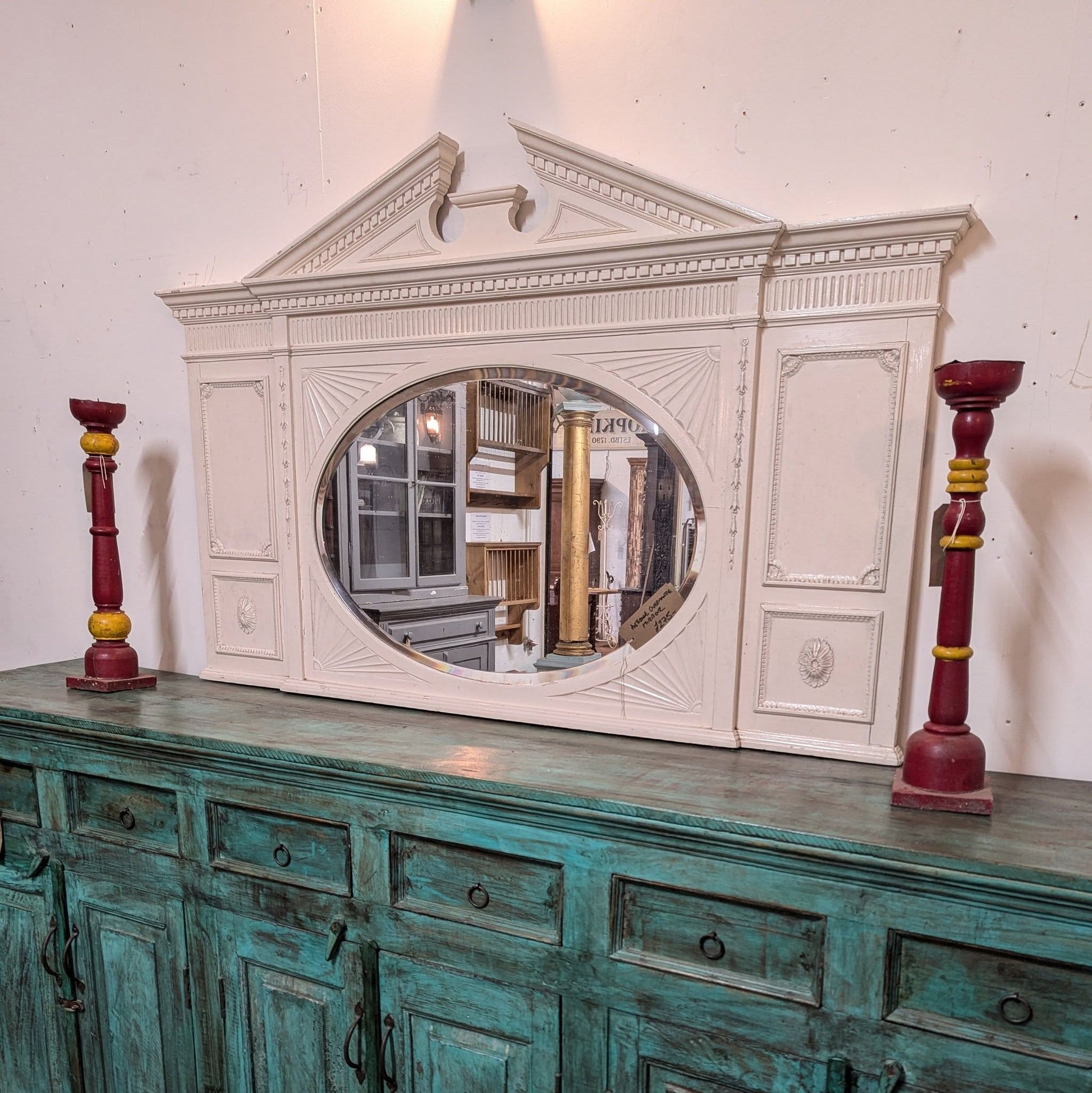 An impressive and rather grand overmantle mirror. This piece is probably late 19th or early 20th century with a handwritten note on the back saying that the glass was resilvered and the whole frame stripped and repainted in the 70s.