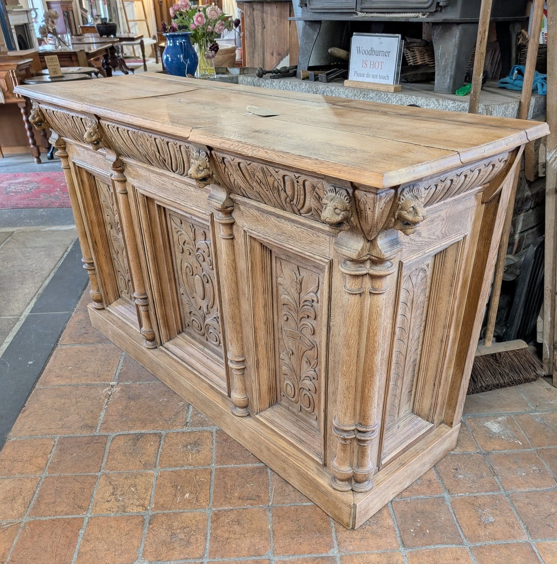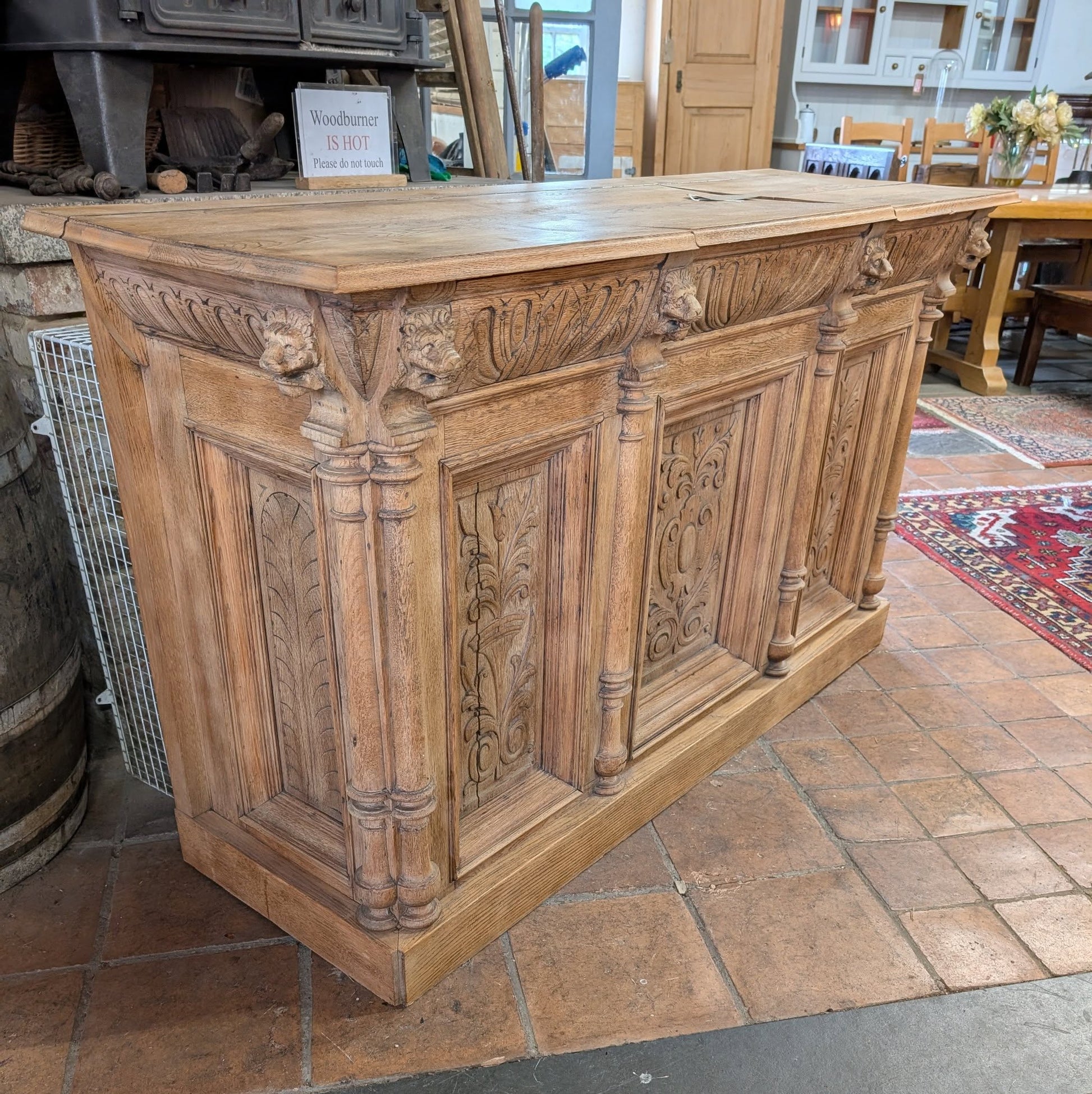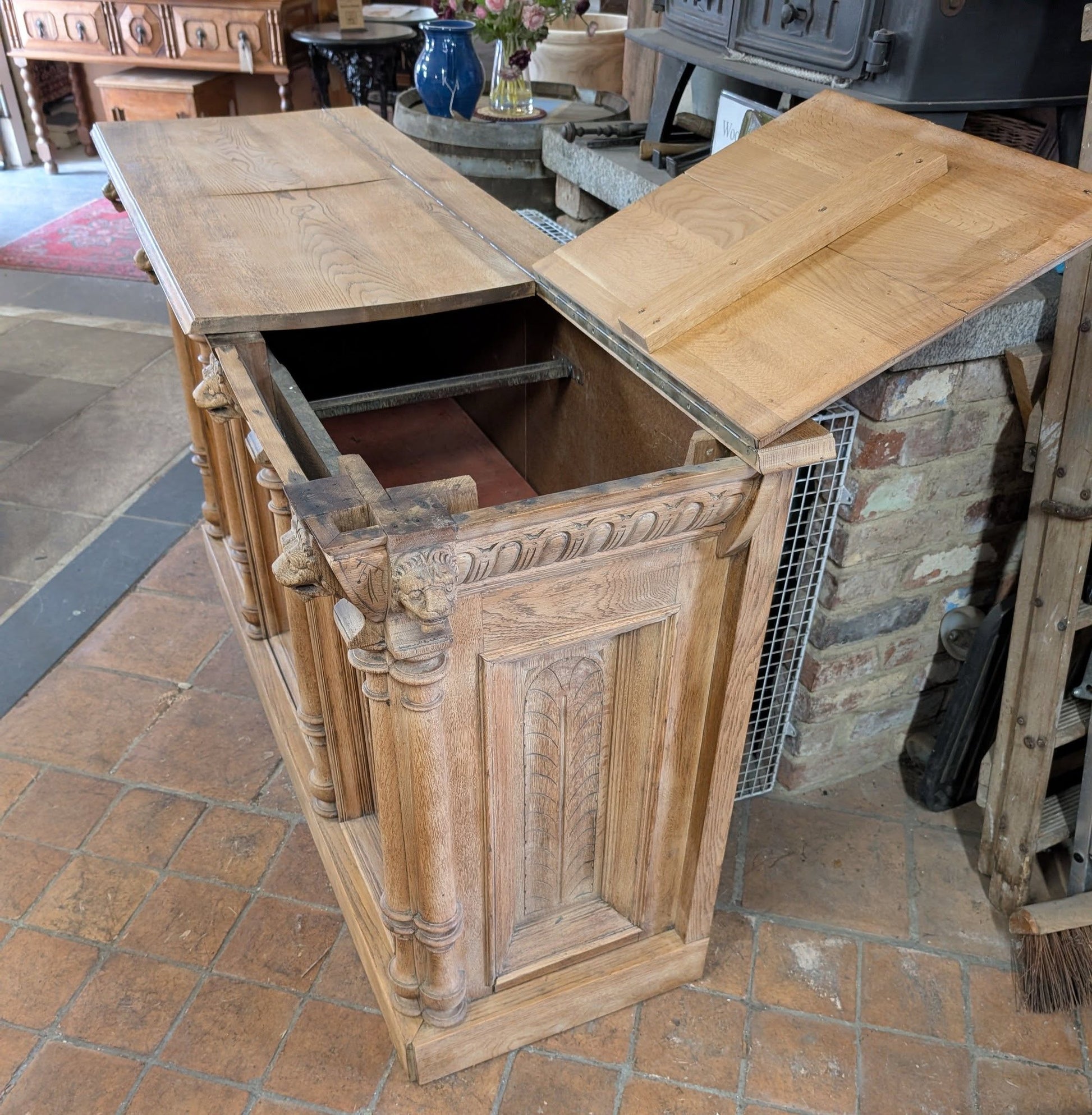 A heavily carved oak counter with lift up lids. The back should be open for access to the single shelf but currently has boarding covering it over (our guess is that it was used up against a wall and left closed). This could be easily removed if used as a counter or bar though. One lift up lid is cracked but still together.