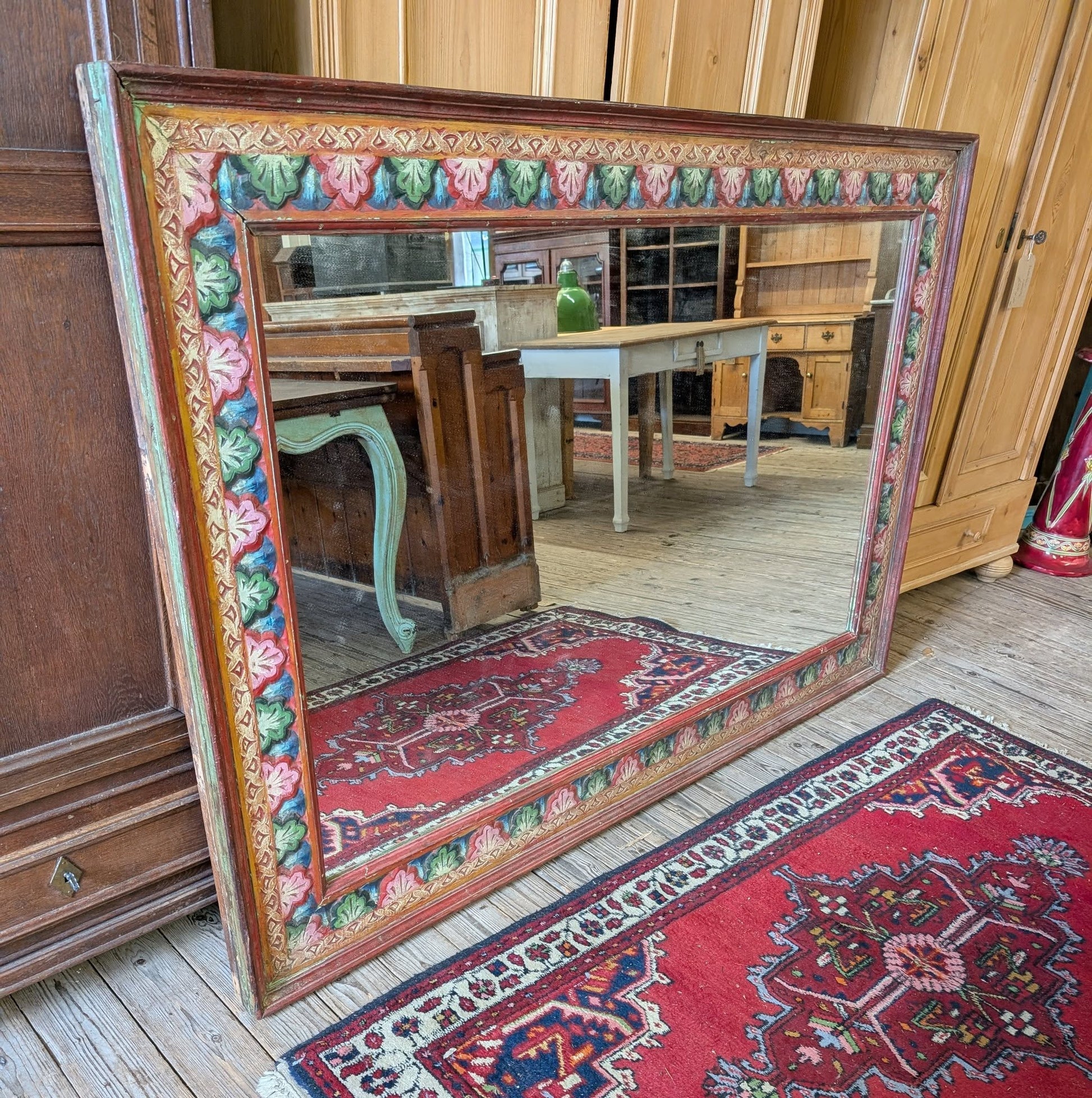 A huge 6ft x 4ft Indian mirror. This actually came in ages ago but with a picture mounted in the middle. Sadly elements of the picture were pretty badly done so we have removed it and mounted a mirror instead, now it is a truly unique and very impressive mirror. The frame is made from old teak so this is quite a heavy thing (approx 42kgs). It could also stand the other way up too if needed.