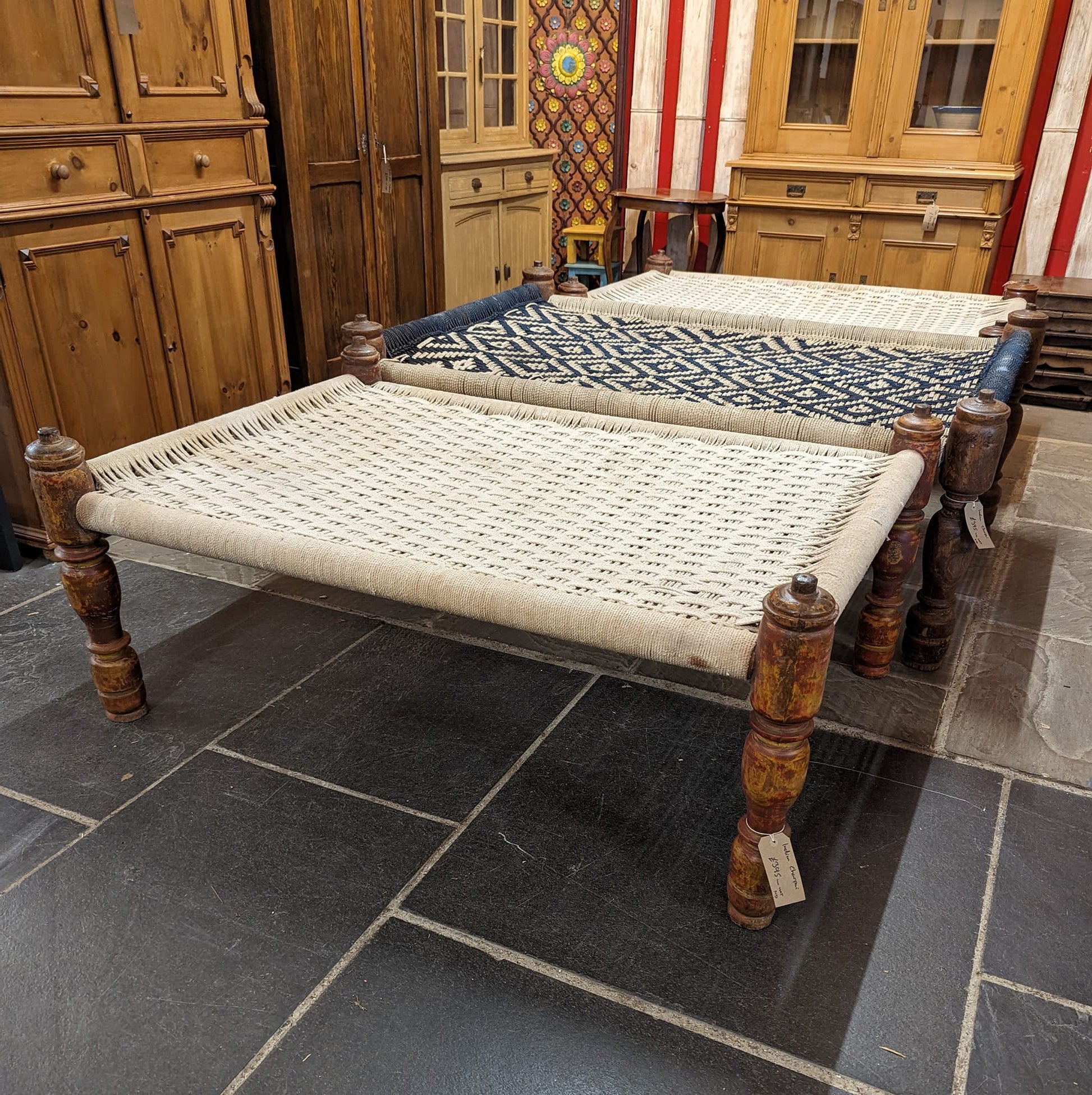 We have 1 left of these wonderful Indian Day Beds (or Charpai meaning "four legs"). These would be used in India for lunchtime or afternoon naps during hot days.