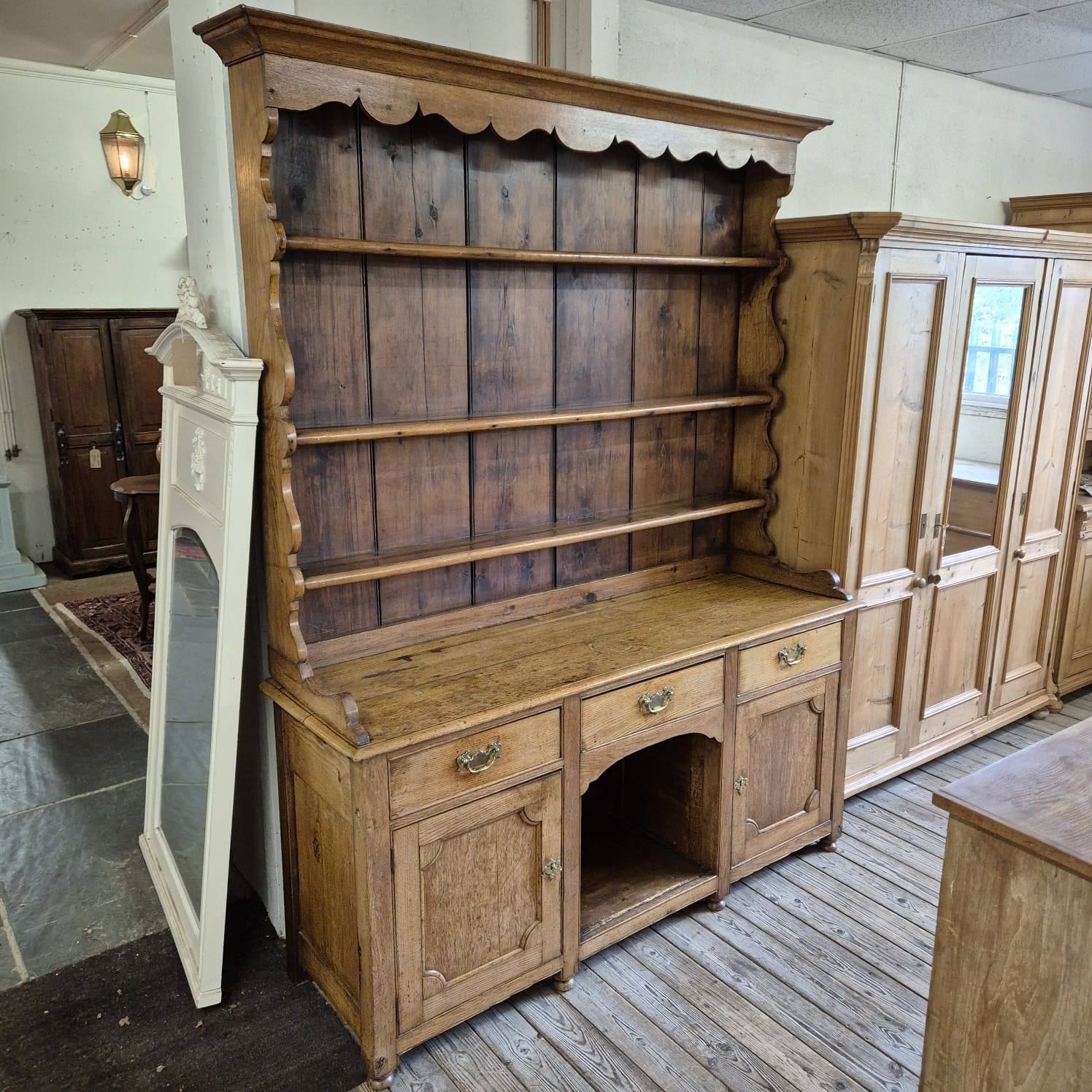 A very lovely antique pine dresser. This one comes in two parts for transport and is 168cm wide x 50cm deep x 216cm high.