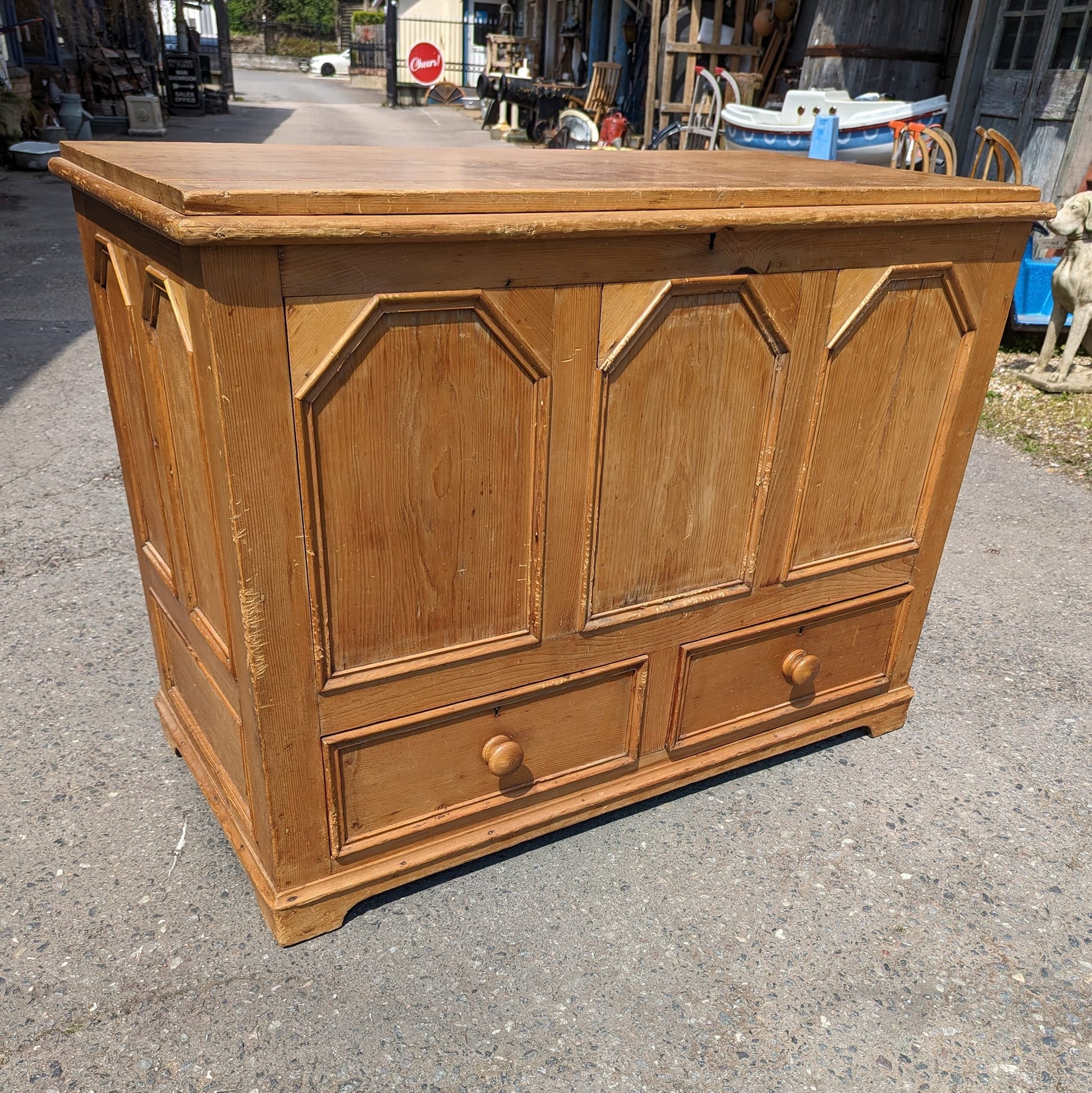 A beautiful looking and rather large mule chest with lots of storage space and two drawers at the bottom. A great thing in waxed pine which has sadly suffered some scratches likely from a dog or something. Since the photo was taken we have sanded some of them back but not all. (See additional photo).