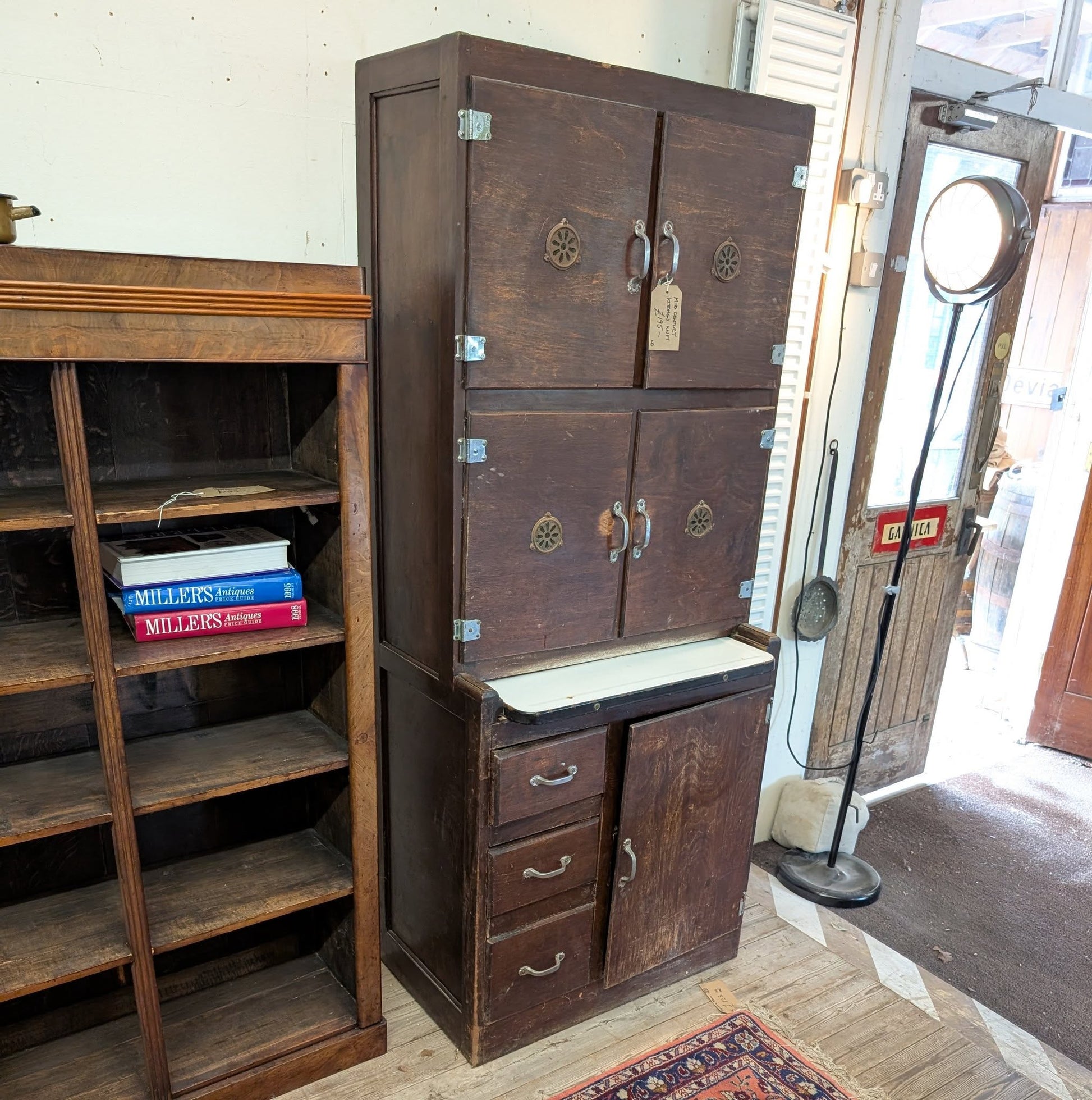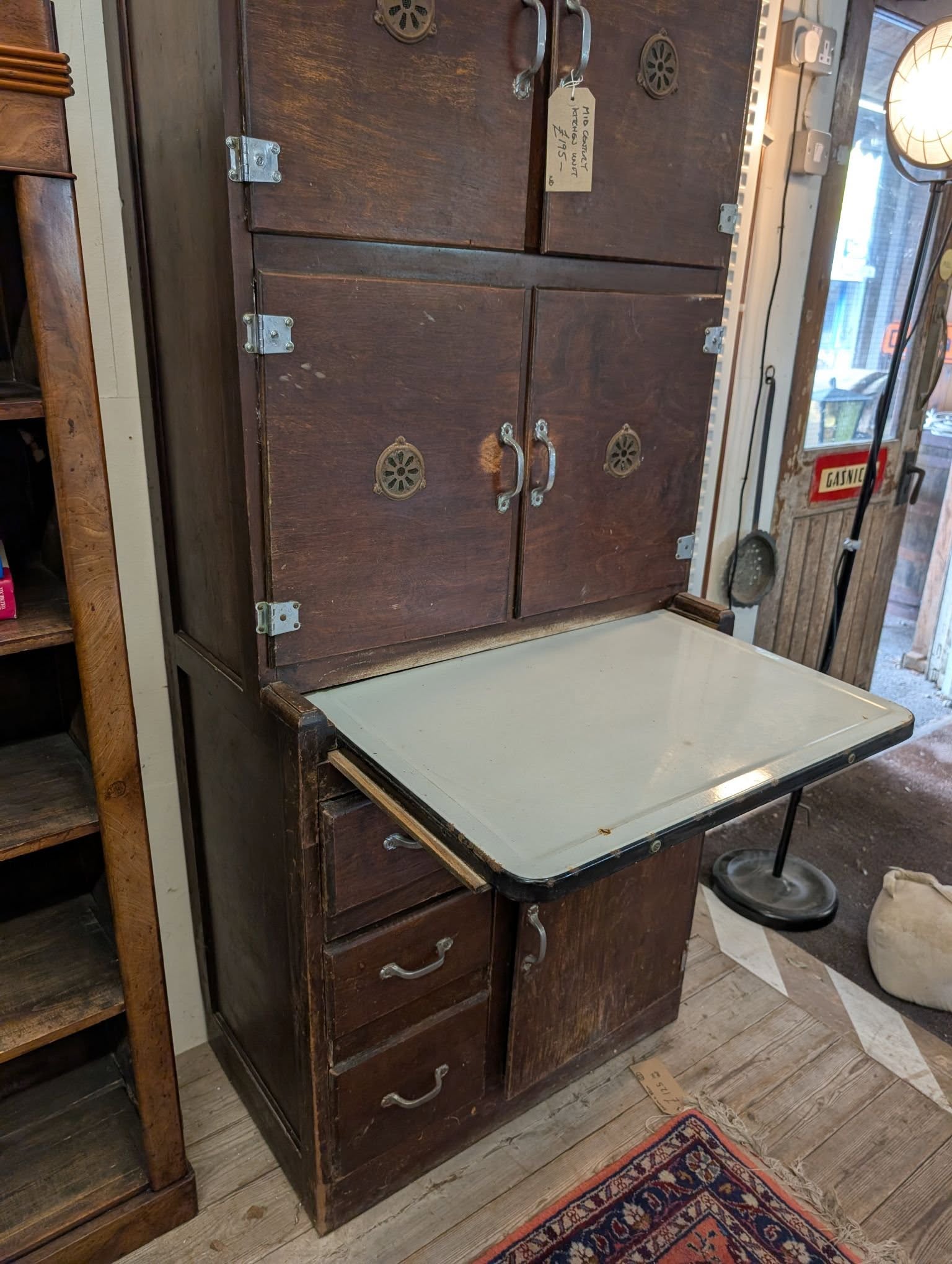 Here's a nice mid century kitchen unit. We don't get many of these and they do tend to be popular. A fun piece of useful furniture with the pull out enamel table top (see additional photo).