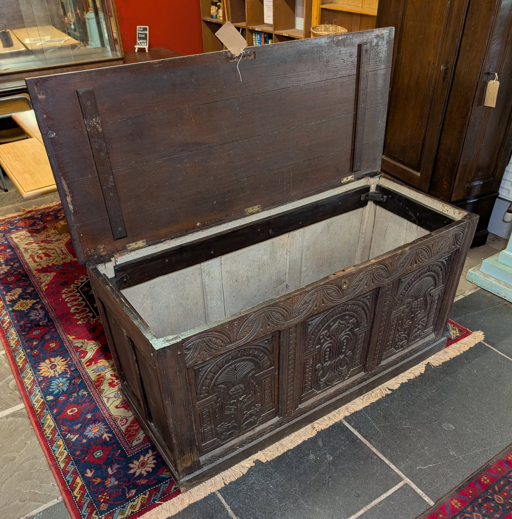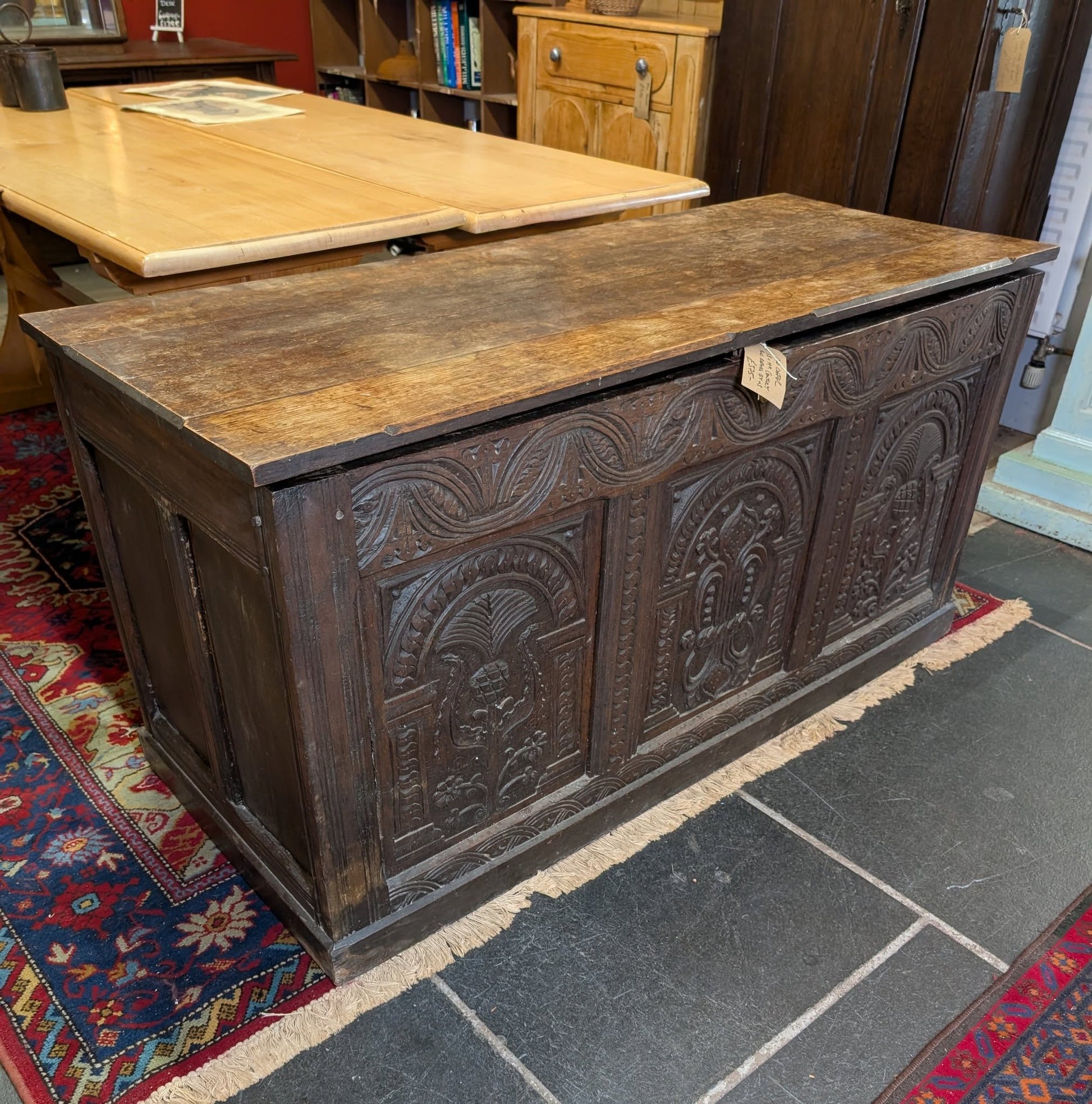 This lovely old coffer came in some time ago but needed a fair amount of structural work so has only just come down from the workshop. It looks to be a mix of 18th & 19th century with bits changed and added over time then we have added some timber inside to make it structurally sound. A lovely old piece with some great carving on the front.