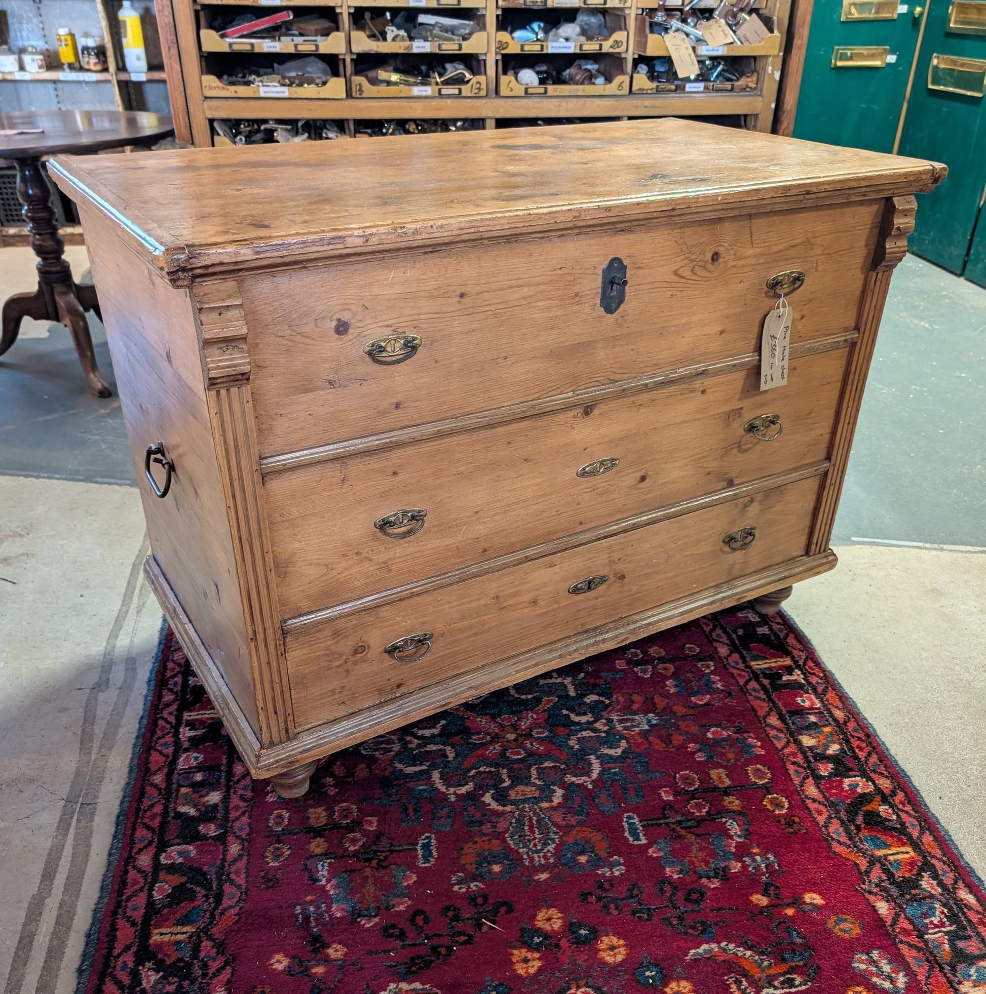 A lovely old mule chest disguised as a chest of drawers. See additional photo for inside. One large storage area with a single wide drawer at the bottom.