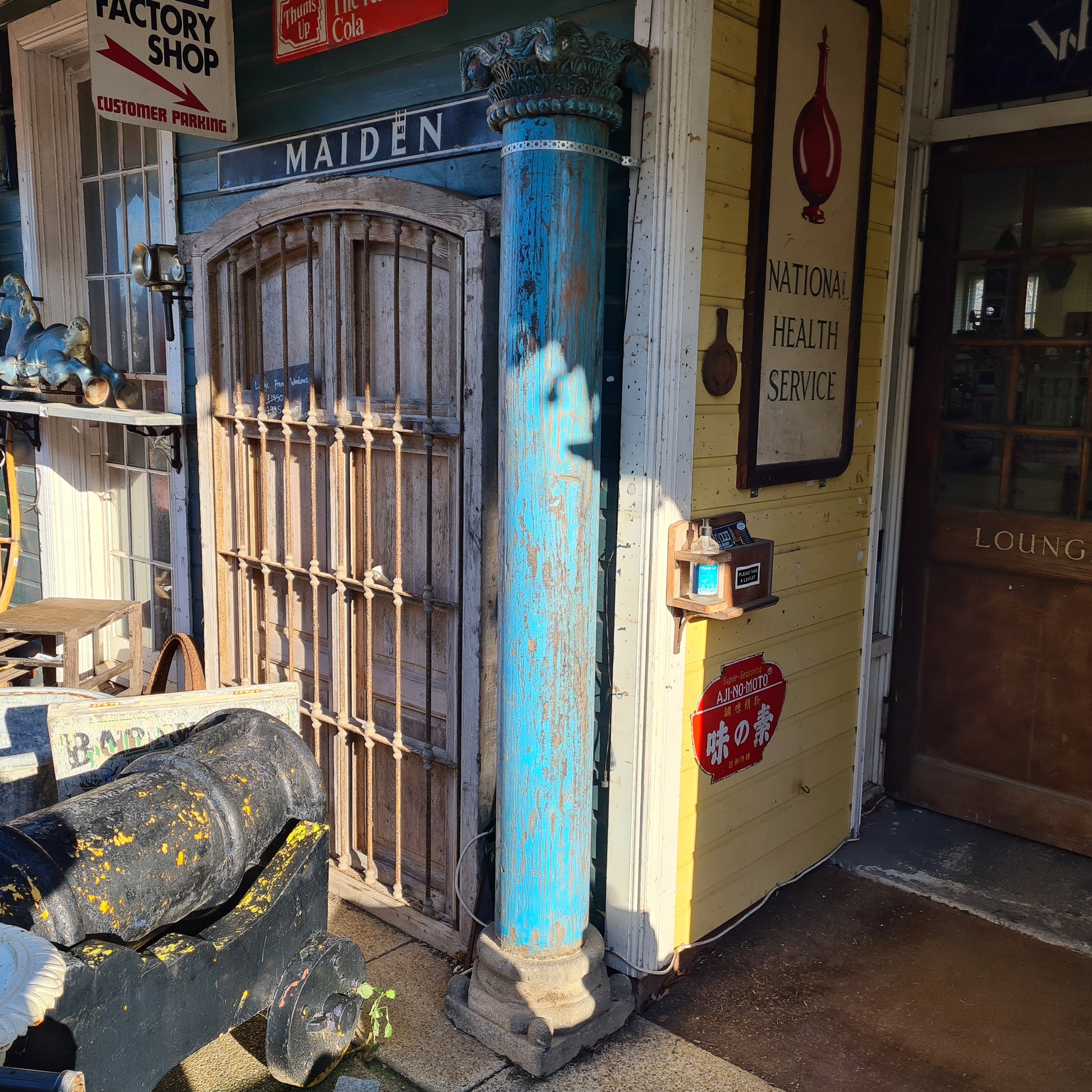 A beautiful pair of stunning blue painted teak pillars with concrete bases.