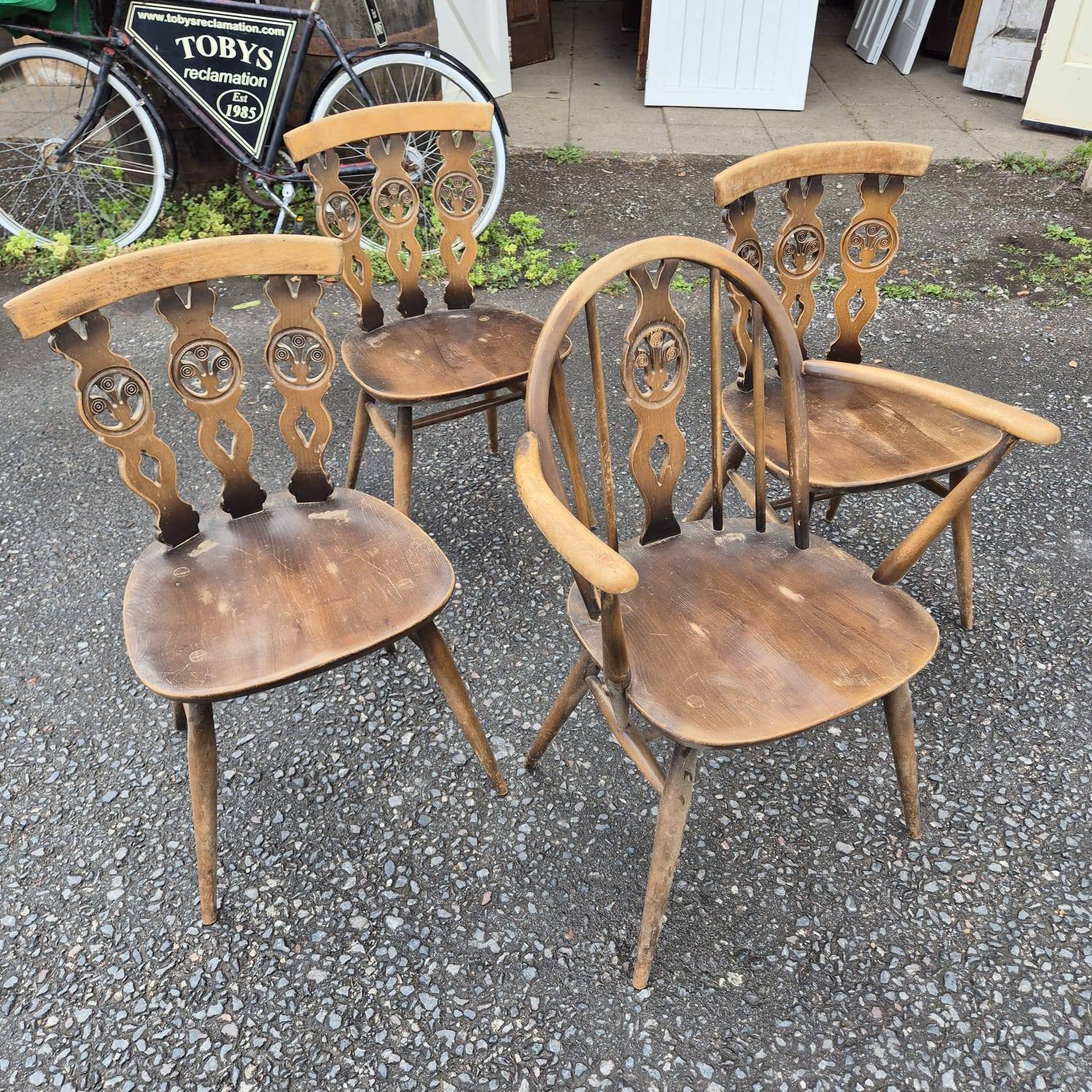 A set of four lovely Ercol chairs in the Fleur de Lys design that we picked up from a local farm. This isn't a design that we've seen here before but a nice rustic country cottage style/look.