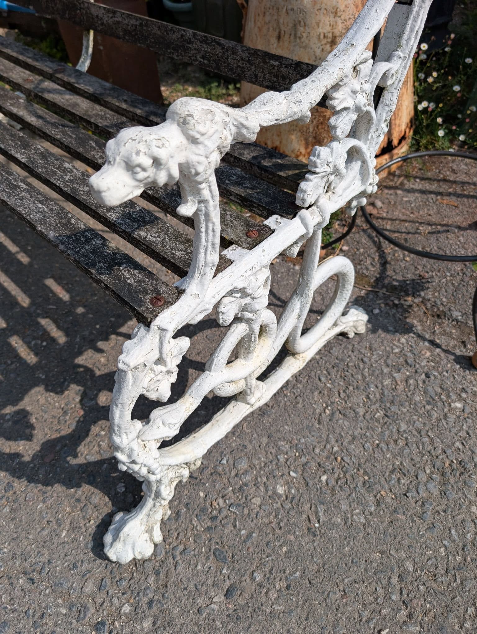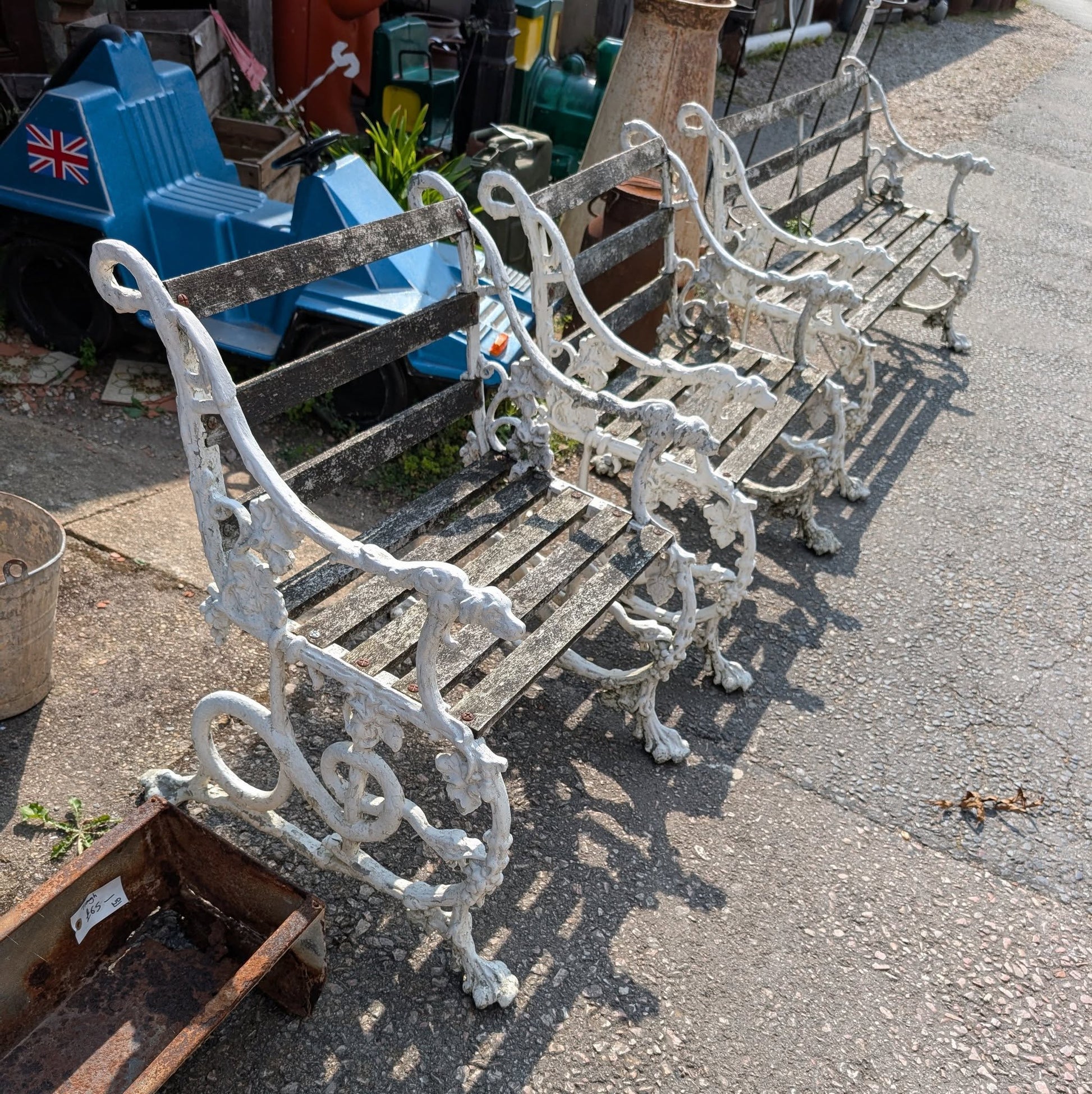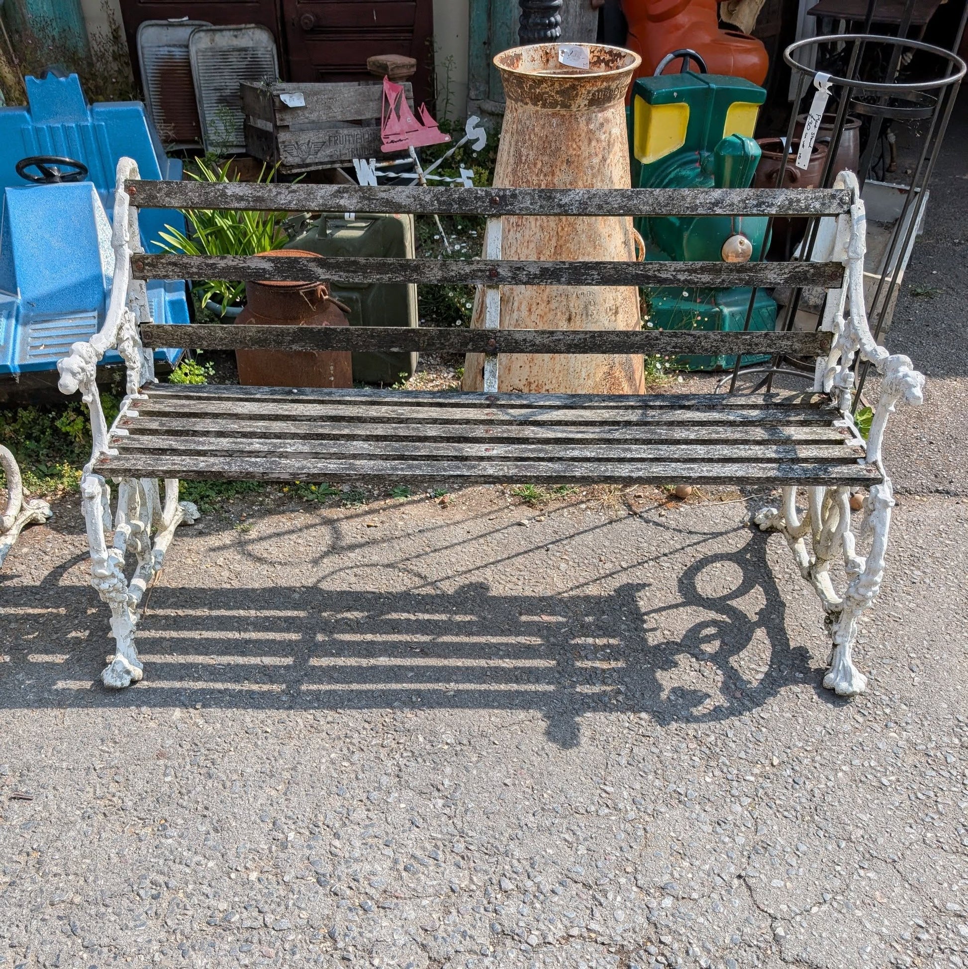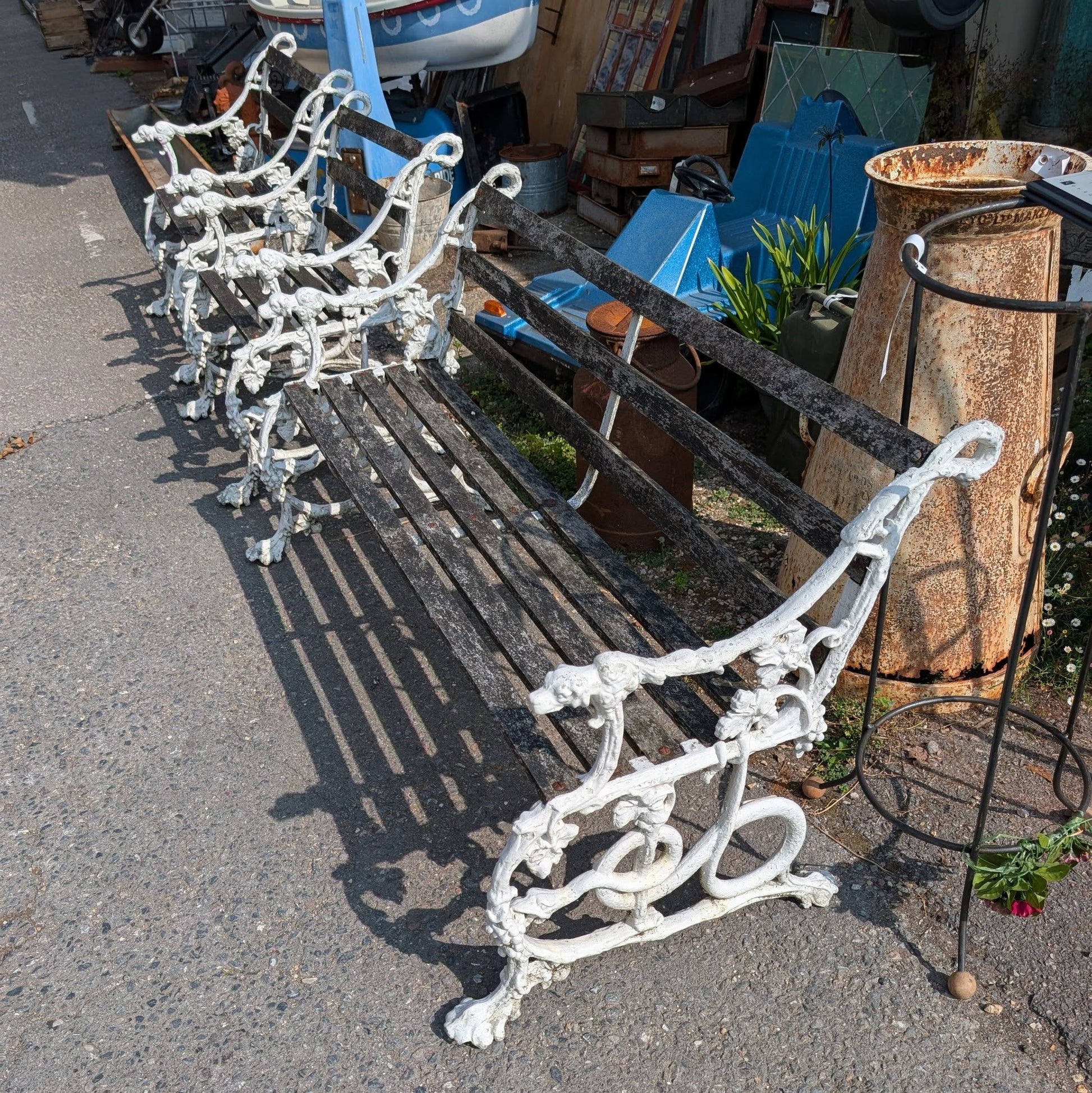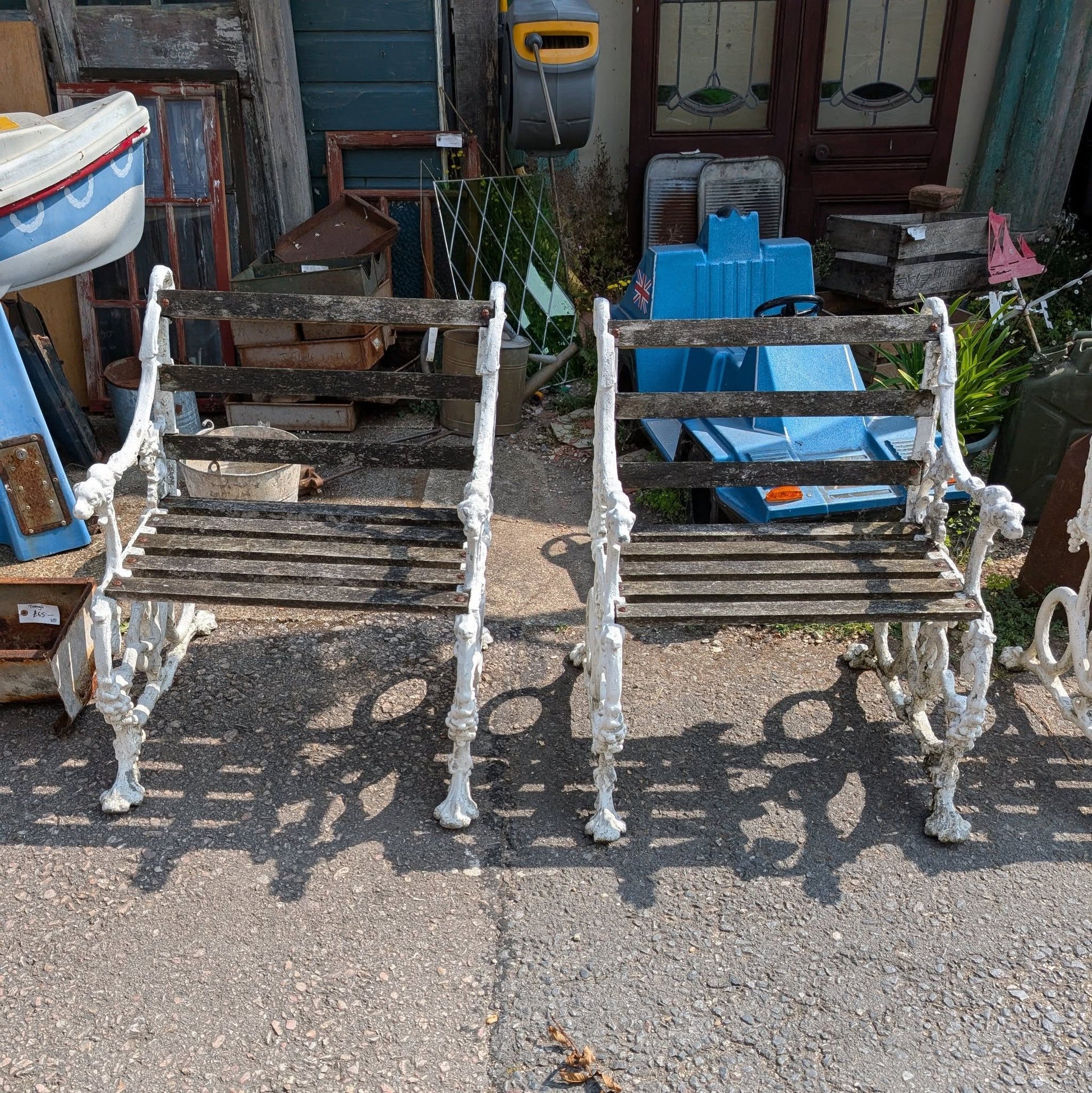 We have this rather lovely set of iron benches with wooden slats. These are in the style of Coalbrookdale (sadly we can't find that written on them anywhere though!) and they are the hound, serpent & grape design. The timber is well weathered and aged - the chairs are fine but the bench is a little springy. I've sat on it and it.was fine but these are old benches so could either do with being treated delicately or possibly having the seats reslatted.