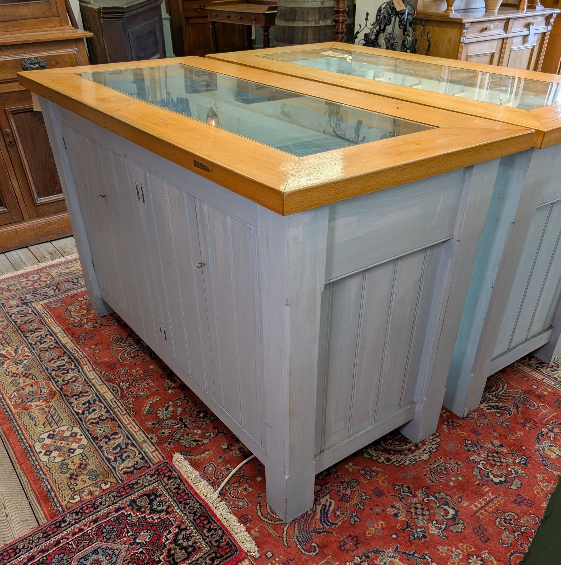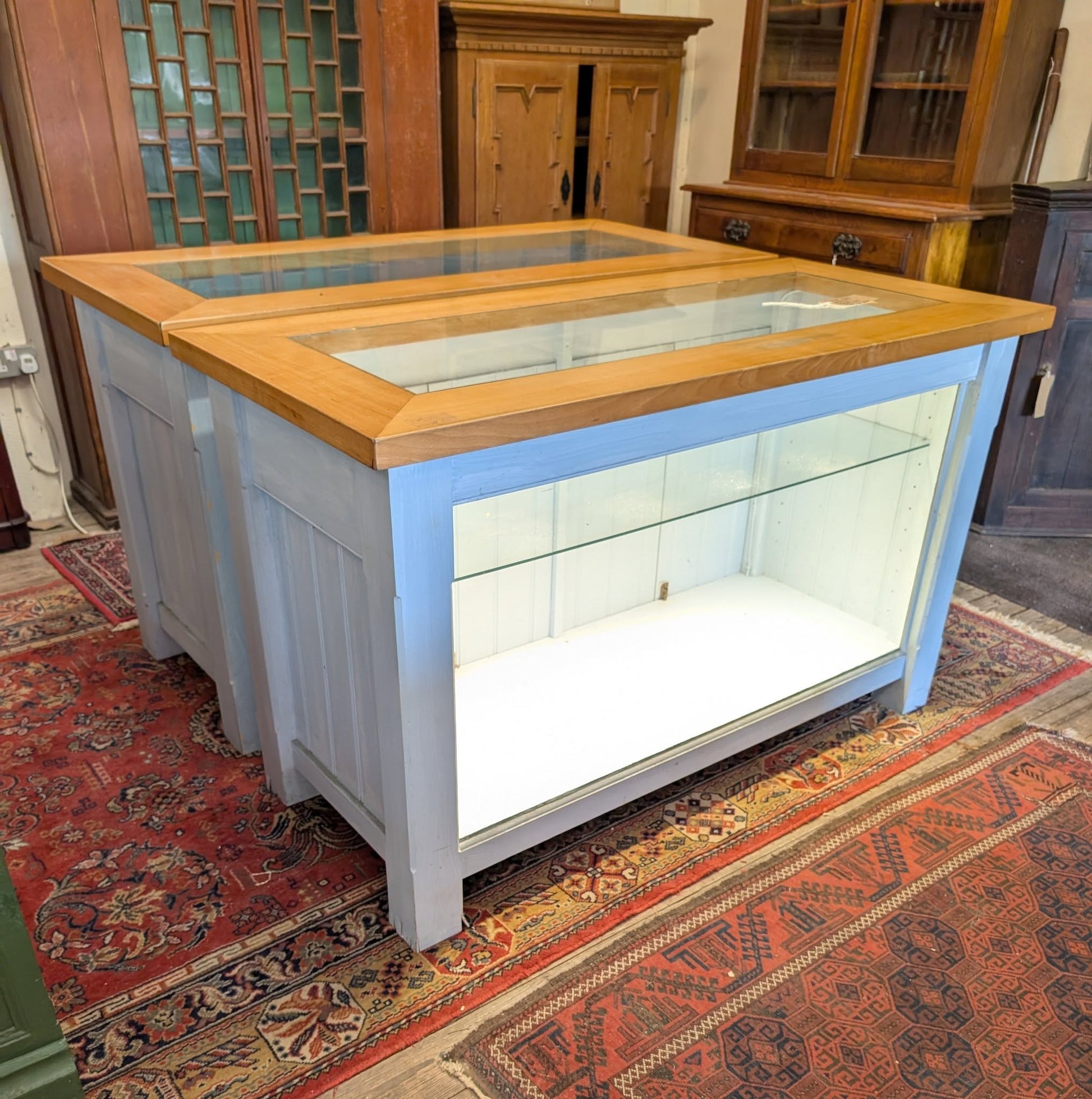 We have two of these shop display cabinets. Both the same with a glazed front and top then double doors on the back. They have been wired with lights but only one set is good to go with the other needing attention.