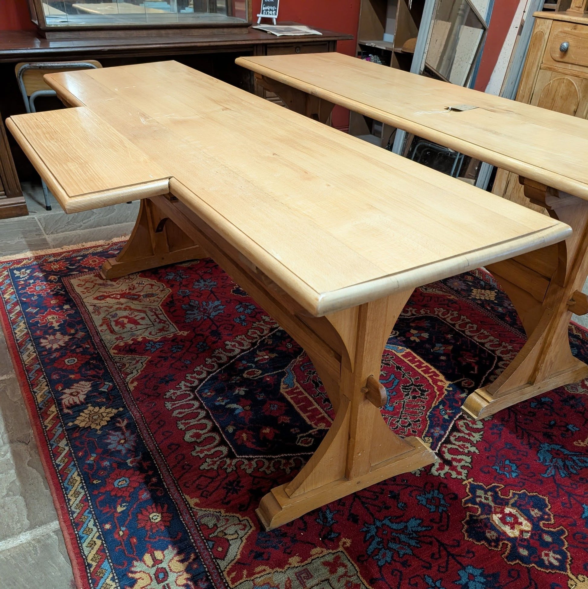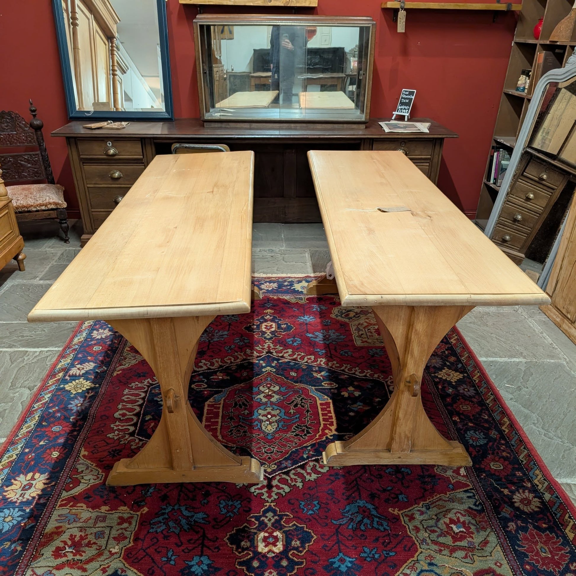 Here are two long/slim tables diect from a Belgian monastery. They are sold individually but can also be bought as a set and used as one very long table. One of them has an odd side attachment that apparently the monks said was for when they were studying very large books! (See additional photo).
